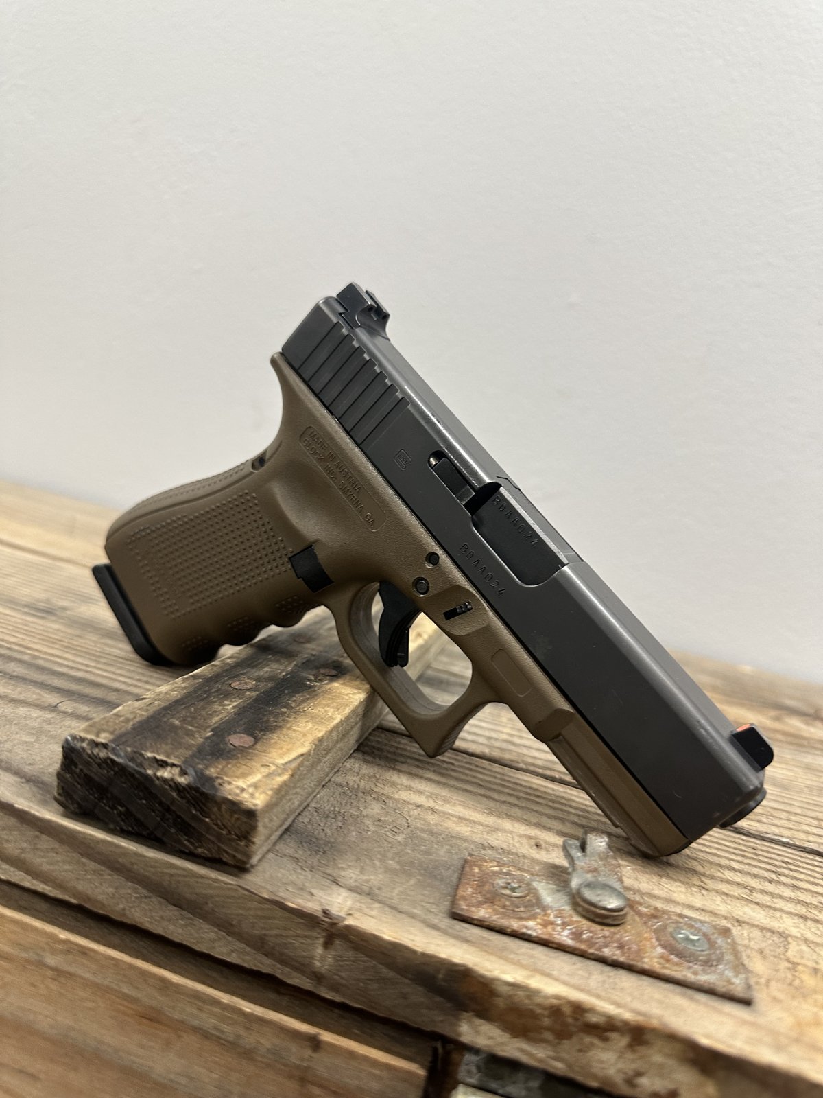 Glock 19 Gen 4, 4″ Barrel, Trijicon Night Sights, Semi-automatic, Handgun , Dark Earth, Includes OEM Case, OEM Backstraps, 2 Magazines